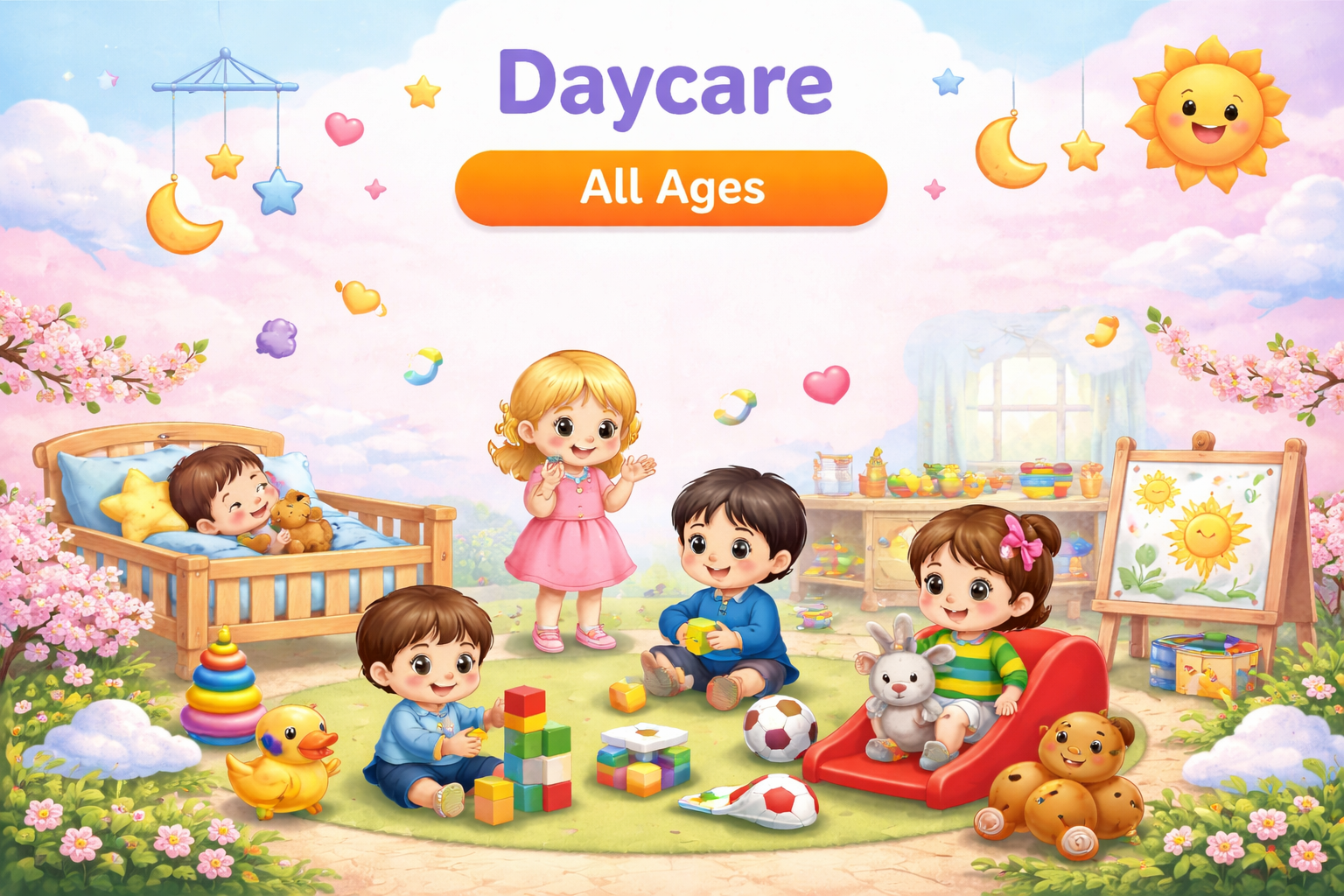 A safe and comfortable space where children enjoy supervised playtime, learning activities, and restful nap time in a caring environment.
